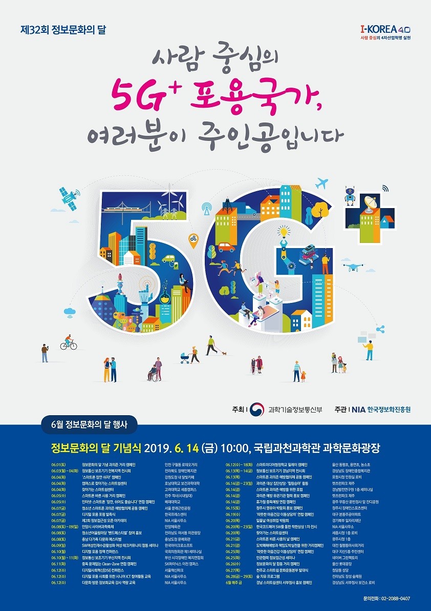 한국정보화진흥원에서 개최하는 "제32회 정보문화의 달" 행사 소식을 알려드립니다. 우리나라 정보문화의 확산을 위해 1988년부터 매년 "정보문화의 달"을 개최하여 왔습니다. 올해 32회째를 맞이하여, 오는 6월 14일(금) 과천과학관 과학문화광장에서 기념식을 개최합니다. 정보문화유공자 시상식을 시작으로 "시민을 위한 5G 기반 디지털 포용국가를 위한 대국민 토론회", 격차해소/과의존 분야 11개 기관이 참여하는 "5G+ 디지털 포용 협력 네트워크 협약식", 캐리와 친구들/옹알스 축하공연 및 50여개의 다양한 체험/홍보 부스운영 등 정보문화 관련 전문가 및 관계 기관 뿐만 아니라 인근 시민들도 함께 참여하고 공감할 수 있는 시간으로 마련하였습니다. 저희 손말이음센터도 과학문화광장에서 홍보부스를 운영할 예정입니다. 많은 관심과 참여바랍니다. 또한 국민생각함을 통해 "디지털 포용에 대한 국민여러분! 생각듣기" 이벤트를 진행중이오니(300명 추첨 5천원 상당 기프티콘 제공) 여러분의 많은 참여 부탁드립니다. (http://idea.epeople.go.kr/idea/pollView.do?ideaCd=190528-00018 )