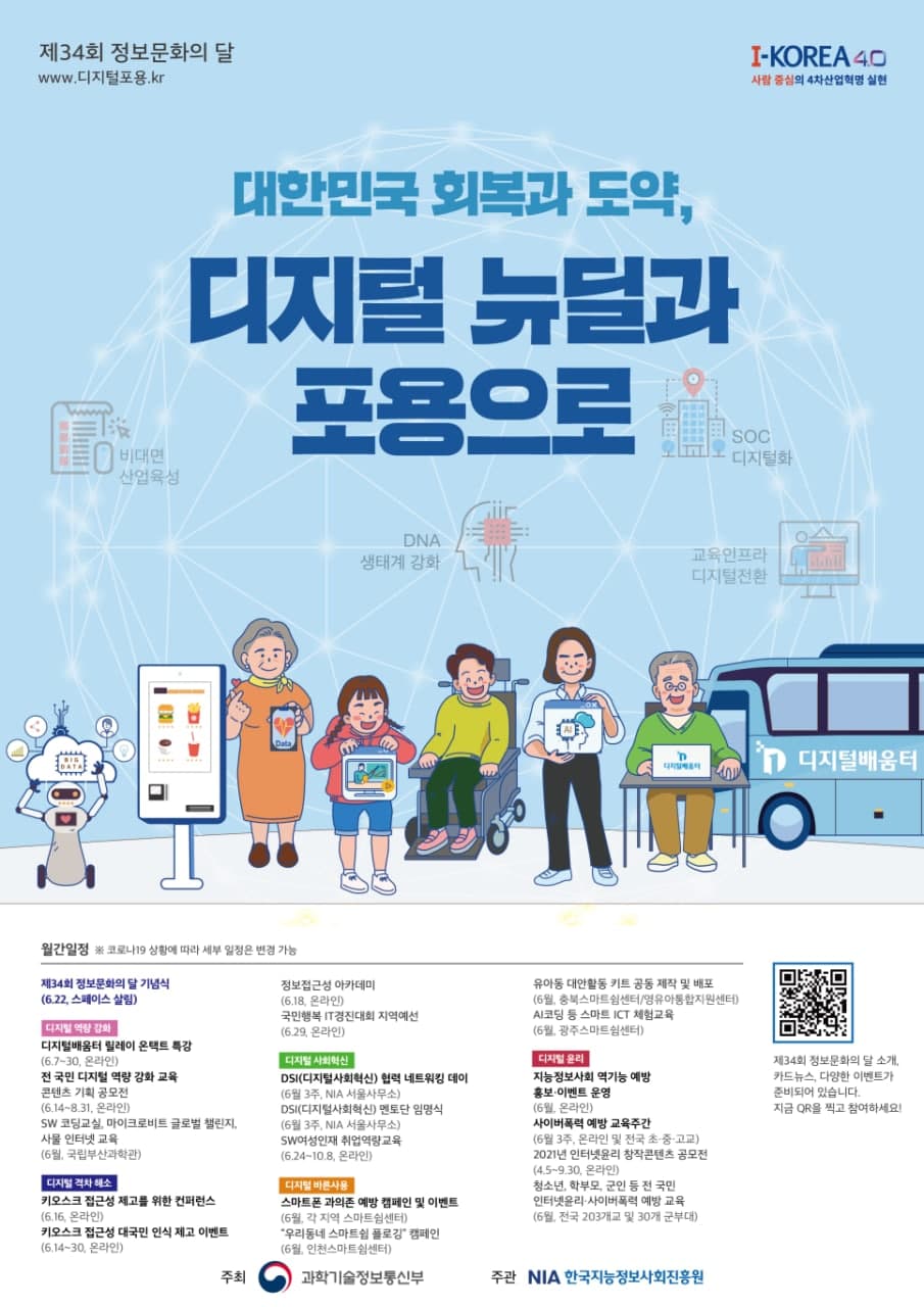 한국 지능정보사회진흥원에서 개최하는 '제34회 정보문화의 달' 행사 소식을 알려드립니다. 우리나라 정보문화의 확산을 위해 1988년부터 매년 "정보문화의 달" 행사를 개최하여 왔습니다. 올해 34회째를 맞이하여, 오는 6월 22일(화), 스페이스살림에서 기념식을 개최합니다. 디지털 역량 강화 교육을 시작으로 키오스크 접근성 관련 디지털 격차해소 프로그램, 디지털 사회혁신, 디지털 바른사용, 디지털 윤리 등 각 분야별 다양한 프로그램을 제공하오니 많은 관심과 참여 부탁드립니다. 감사합니다.![]()