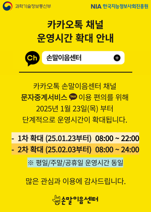 안녕하세요. 손말이음센터 운영자입니다. 중계서비스 이용 편의를 위해 2025년 1월 23일(목)부터 카카오톡 손말이음센터 채널 문자중계서비스 운영시간을 단계적으로 확대합니다. 카카오톡 문자중계 이용가능시간 ※ 평일/주말/공휴일 동일 ○ 1차 확대 (25.01.23부터) 08:00 ~ 22:00 ○ 2차 확대 (25.02.03부터) 08:00 ~ 24:00 많은 관심과 이용에 감사드립니다. ※ 카카오톡에 영상중계 기능이 없어, 문자중계서비스만 가능하오니 참고 부탁드립니다. 이용방법 - 카카오톡 앱에서 '손말이음센터' 를 검색하여 채널에 접속합니다. - 카카오톡 손말이음센터 채널 우측 상단 말풍선을 클릭하면 채팅창에서 중계사에게 문자중계를 요청할 수 있습니다. - 중계사에게 통화하고 싶은 상대방의 전화번호를 전달합니다. - 중계사로부터 통화상대방과 전화가 연결되었다는 메시지를 받으면 전하고자 하는 통화내용을 문자로 전달합니다. 또한 손말이음센터 모바일앱 서비스가 종료 되었습니다. 홈페이지(107.kr) 또는 카카오톡 채널을 통해 많은 중계 이용해주시고, 카카오톡 채널 구독 부탁드립니다. 감사합니다. ▶▶ 카카오톡 손말이음센터 채널 바로가기