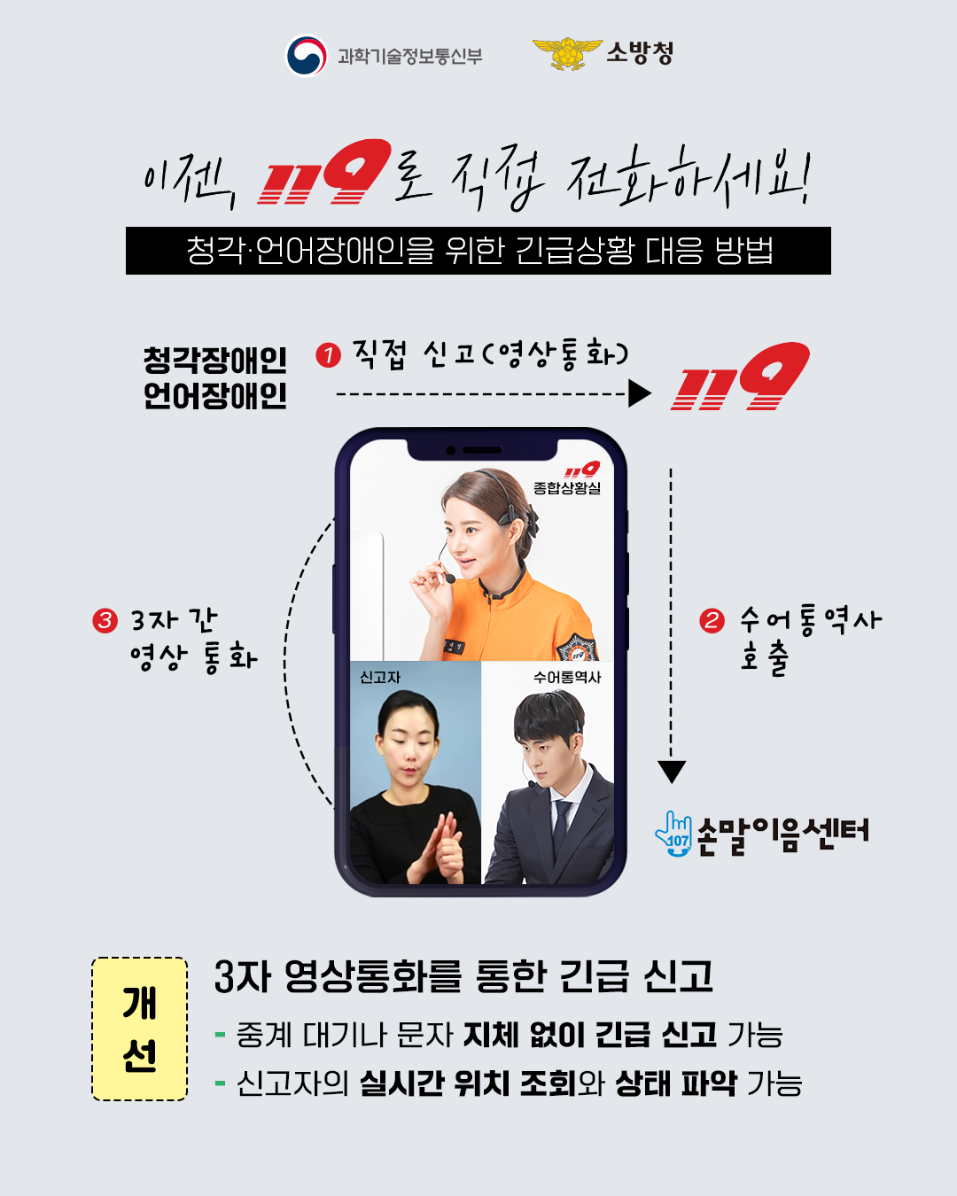 과학기술정보통신부·소방청 간 협업 청각·언어장애인의 긴급상황을 돕는 119 수어통역 서비스 시작 [카드뉴스] 과학기술정보통신부 https://www.msit.go.kr/bbs/view.do?sCode=user&mId=214&mPid=208&pageIndex=&bbsSeqNo=88&nttSeqNo=3175822&searchOpt=ALL&searchTxt= [관련뉴스] 대한민국 정책브리핑 https://www.korea.kr/news/policyNewsView.do?newsId=148941990 국민 누구나 차별이나 배제 없이 디지털 기술의 혜택을 누릴 수 있도록 디지털 민생지원의 범위를 더욱 넓혀 나가겠습니다. - 유상임 과기정통부 장관 청각·언어장애인이 119에 직접 신고할 수 있도록 기존 수어통역사 대리 신고 방식에서 3자 영상통화 시스템으로 개선됐습니다. 유상임 장관은 손말이음센터를 방문해 새롭게 바뀐 119 수어통역 시스템을 점검하고, 수어통역사 등 관계자들을 격려했습니다.